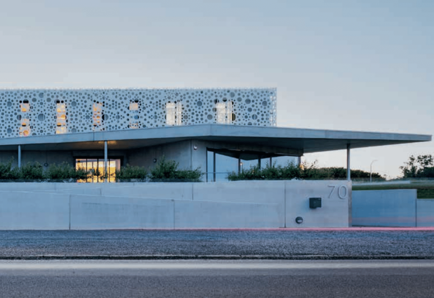 Une distribution centrale dessert l’ensemble de l’étage.L’emploi de cloisons vitrées gomme l’effet tunnel des  deuxzones de circulation. Escalier et ascenseur sont stratégiquement positionnés à l’intersection de celles-ci.Le surplus de toiture du rez-de-chaussée est végétalisé.Une partie est aménagée en terrasse dédiée aux employés.Les contraintes de délai ont orienté l’exécution vers un  système constructif d’éléments préfabriqués essentiellementutilisé dans le  secteur industriel. La  technique des  prémursisolés en béton a permis d’ériger rapidement la  structure. Àl’intérieur comme à l’extérieur, le  béton est laissé apparent.Toutefois, l’image industrielle est cassée par la mise en placed’un élément architecturé qui redonne au bâtiment une plastique mieux en accord avec sa fonction tertiaire. Dès le départ,la  conception s’est inspirée de l’histoire de la  ville d’accueilpour imaginer le nouveau siège. Si Binche est connu au-delà