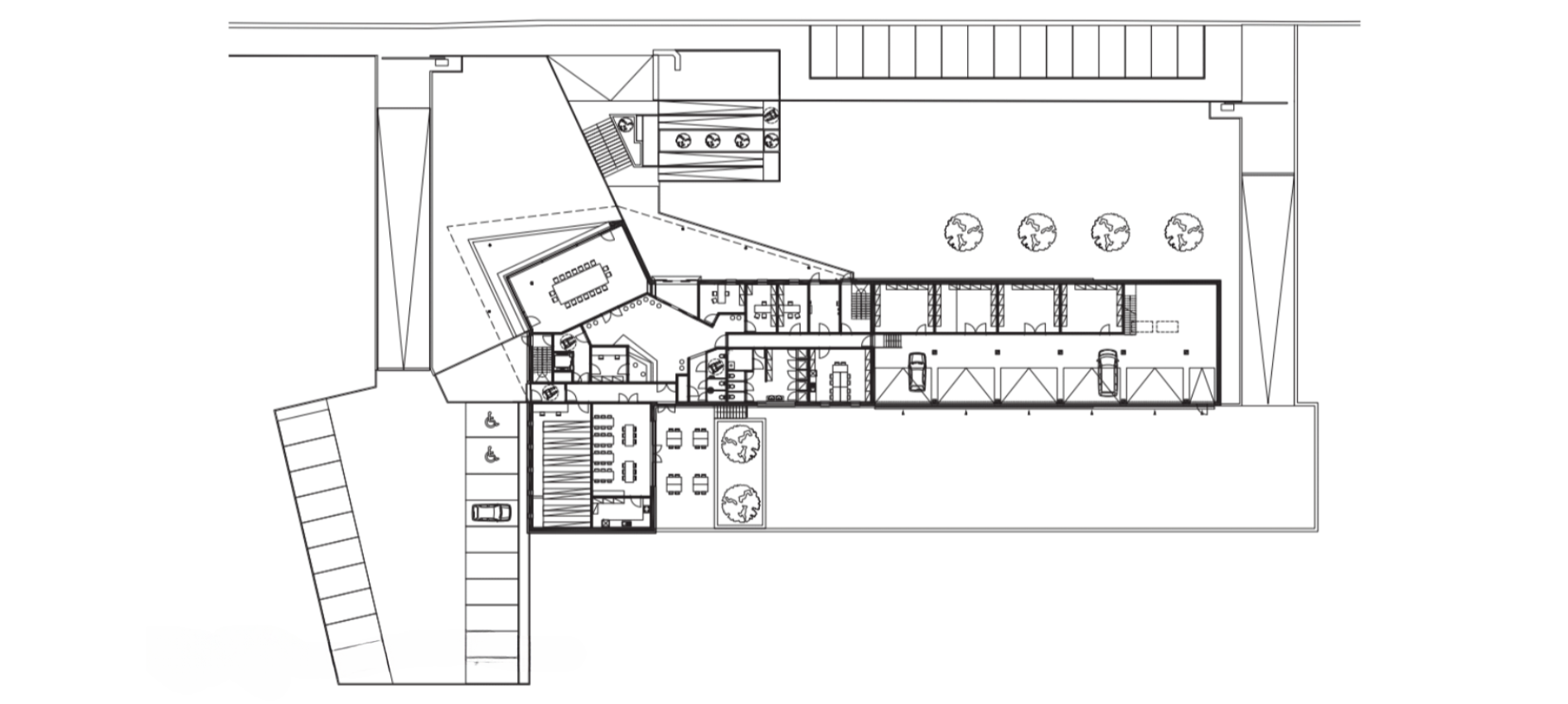 La position en entrée de ville a fortement orienté l’implantationde l’édifice. Celui-ci est composé de deux ailes perpendiculaires. L’aile la plus longue est alignée par rapport à la voirieet l’angle sortant est dirigé vers la sortie de ville. Sur la pointede l’angle est inséré un volume en saillie qui casse la rigueurde l’ensemble.Le bâtiment comporte deux niveaux hors sol. Le rez-de-chaussée est subdivisé en quatre grandes zones: l’accueil des  visiteurs, la  salle de conseil d’administration, des  services dédiés au personnel et la régie technique. Le premier niveau estpartiellement décaissé pour permettre à la régie technique debénéficier d’une hauteur sous-plafond adaptée. La  salle duconseil d’administration est positionnée comme un  diamant.Elle oriente le  visiteur vers l’entrée principale. L’étage comprend l’ensemble des bureaux du personnel. La plus petite aileest dédiée aux services de direction tandis que la plus grandeest occupée par les employés.